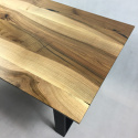Blat o grubości 40 mm wykonano z litego drewna orzechowego, które wyróżnia się naturalnymi sękami i pęknięciami – wypełnionymi czarną żywicą epoksydową. To nie tylko element dekoracyjny, ale również gwarancja niepowtarzalnego wyglądu każdego egzemplarza. Blat został ścięty pod kątem 45 stopni, nadając mu lekkości.